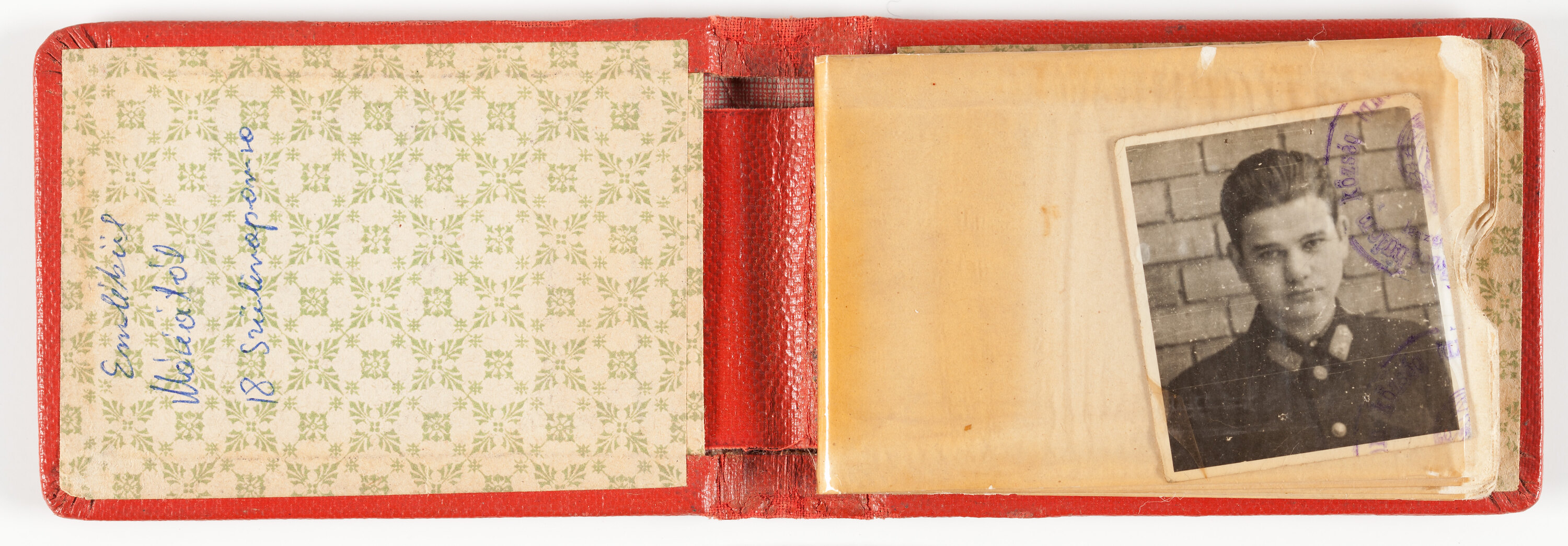 Small wallet sized photograph album in red vinyl, it was given to Julius as an 18th Birthday present, circa 1955. In 1957 Julius came to Australia after he escaped the Russian invasion of Hungary, leaving his family in Hungary, he survived a dangerous journey alone to escape across the border to Austria. He was only able to bring a few possessions with him including his moulding tools, and cigarette holder and photo album, which were 18th birthday presents from a sister and friend.