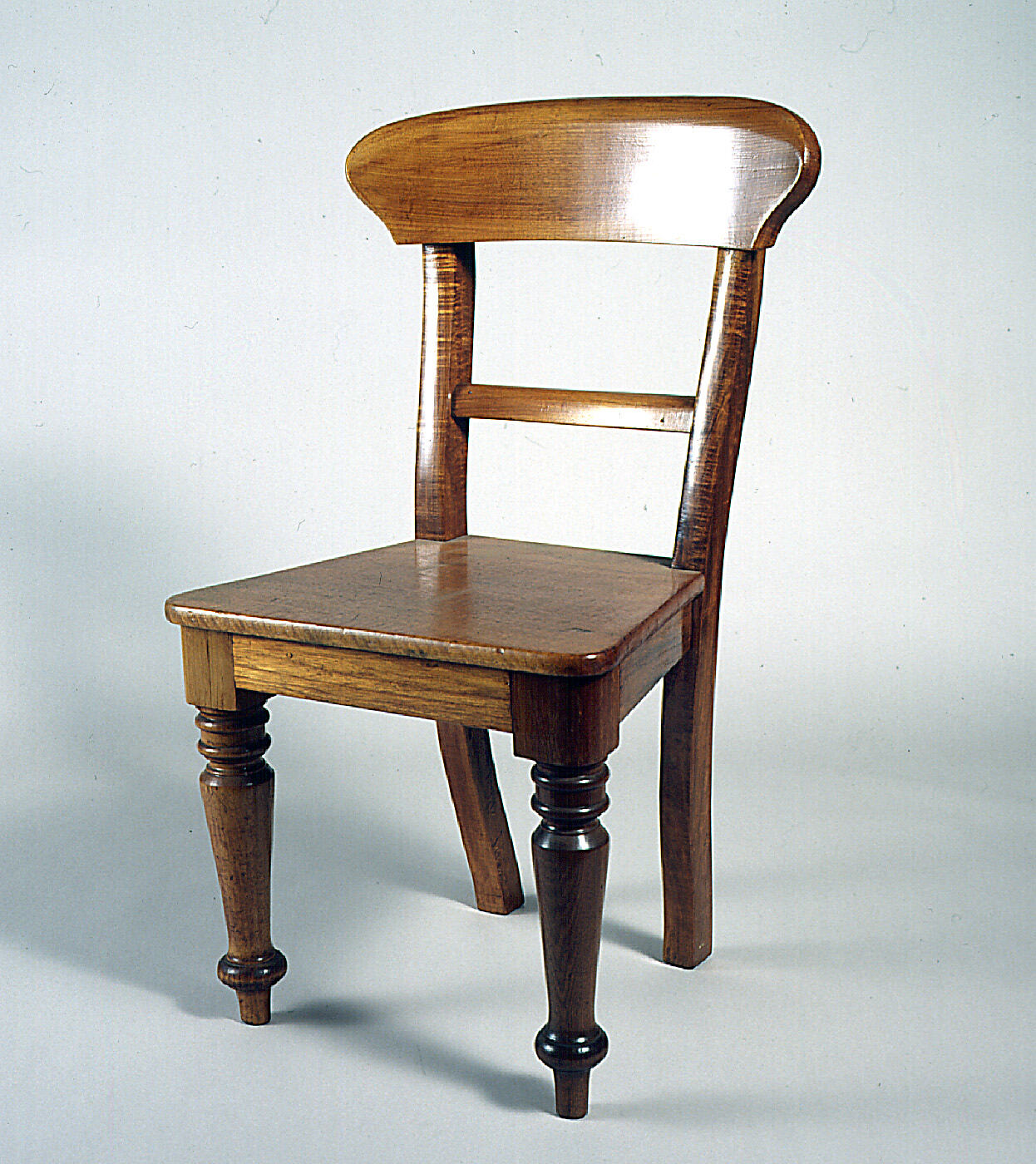 Dining chair is heavy and has slightly tapered oblong seat. Front legs are round, back legs are square and slightly curved. Chair has a wide, high back rest.