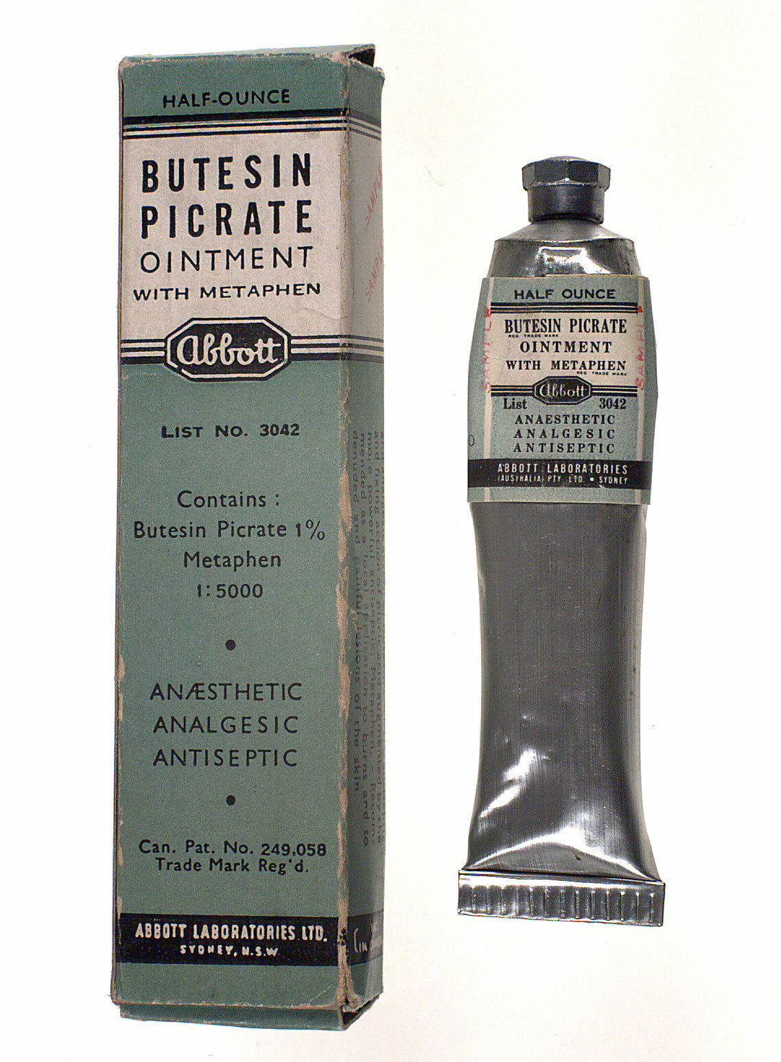 Sample tube of butesin picrate ointment with Metaphen, manufactured by Abbott Laboratories Ltd., Sydney, N.S.W. Applied to burns or skin lesions as a topical anaesthetic, analgesic and antiseptic. Contains corrosive picric acid and mercury.