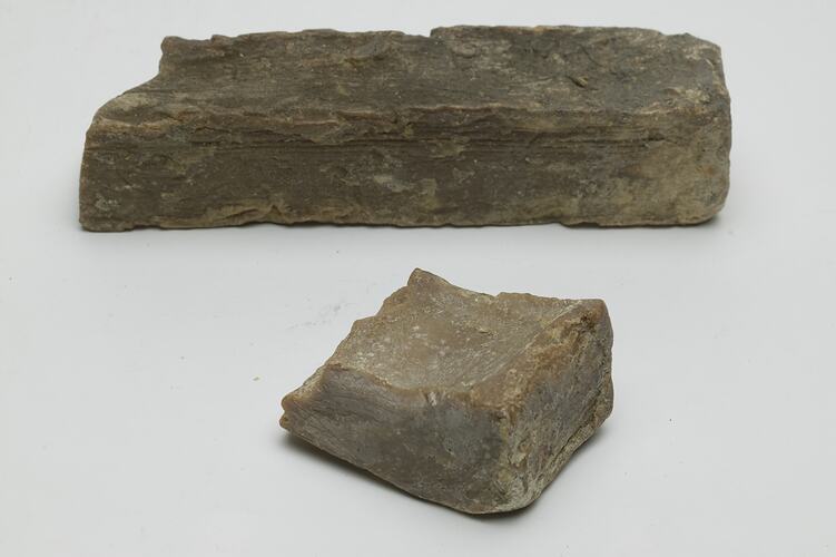 3 bars and 12 broken pieces of greyish yellow handmade soap. The whole bars are 27 x 4 x 4cm but pieces range down to 3cm in length. Note 87.12 - totally disintegrated.