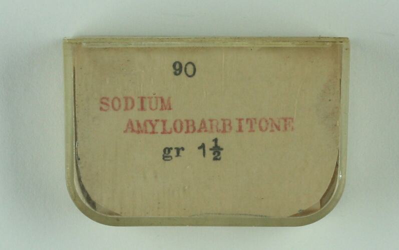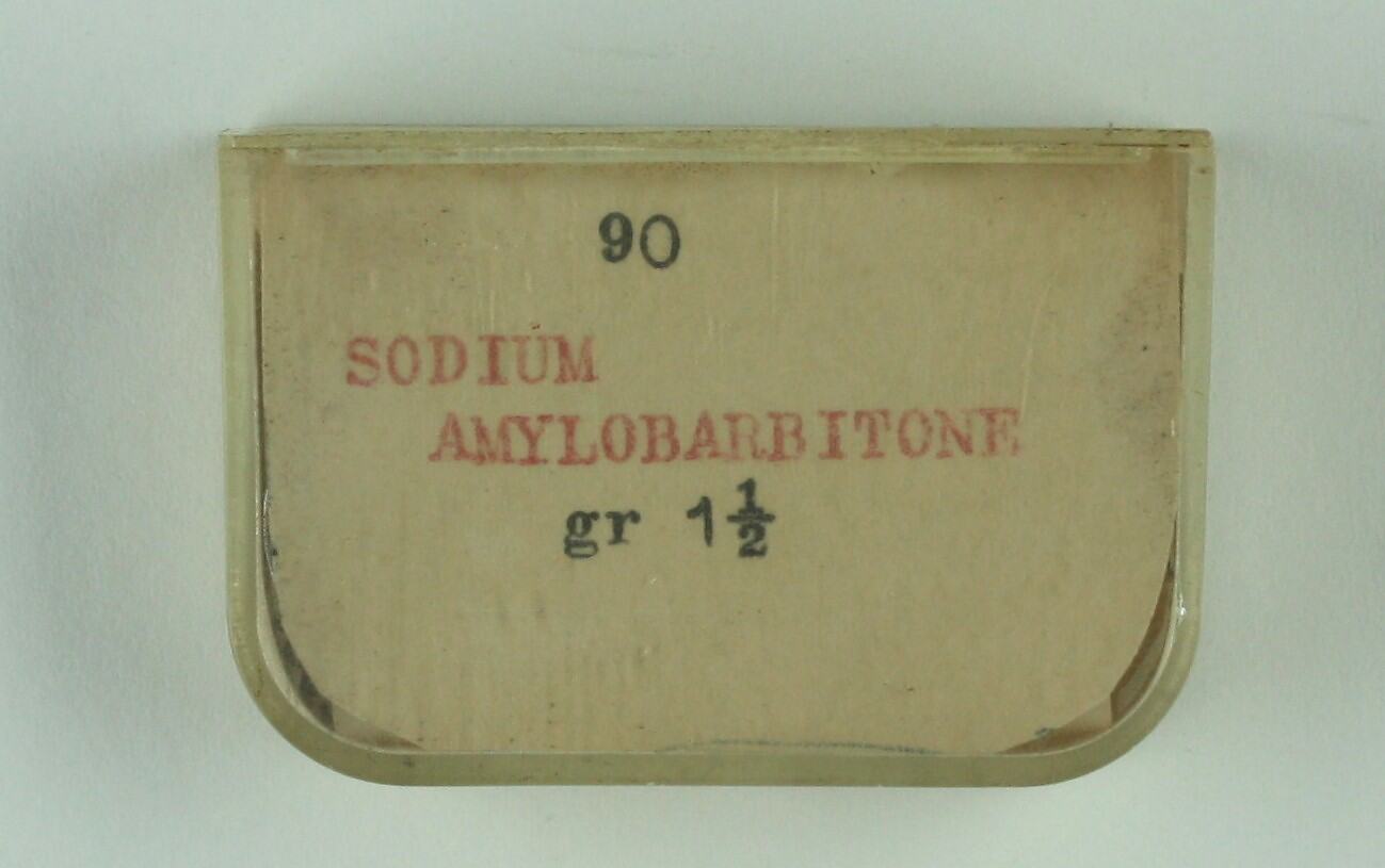 Small, flat, clear plastic box containing the drug sodium amylobarbitone. Box has rounded front corners and labels - 90 sodium amylobarbitone, gr. 1.1/2 - under clear top and bottom. Contains lead pieces.