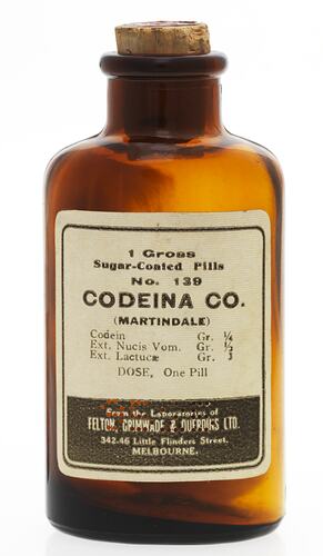 Bottle containing codeine tablets used in the pharmacy of a mental health hospital in Victoria, Australia, circa 1935. Manufactured by Felton, Grimwade & Duerdins Ltd. Codeine is an analgesic with similar uses to those of morphine but has only mild sedative effects.