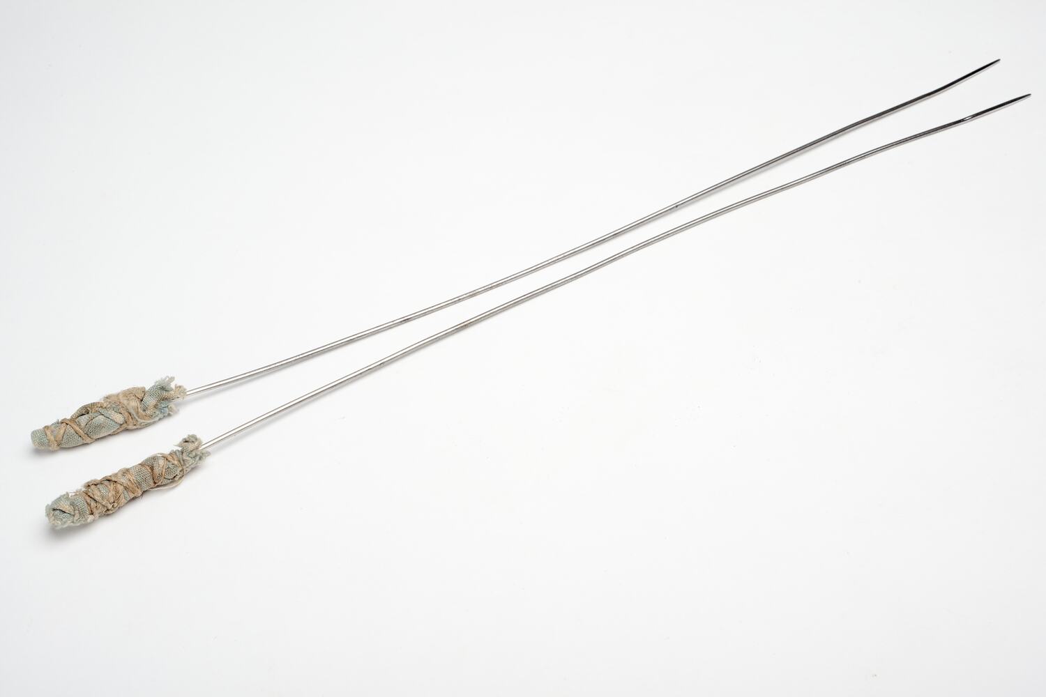 The knitting needles are of a fine gauge shiny steel. At one end of each needle blue and white material is wrapped and tied with string to form the protection needed against damage to clothes whilst in use.