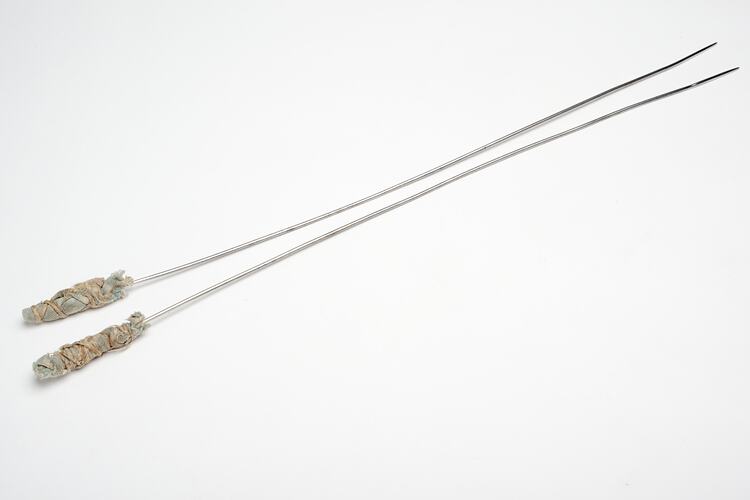 Pair of knitting needles used in the 1950s by Anna Fantini in Italy when she was 11 years old to make shawls, scarves and socks, under her mother's supervision and teaching. The padding at the end of the needles was applied by Anna to avoid wearing out the clothes. In Italy, knitting is done with longer needles than those used in Australia. One of the needles is firmly held under the right arm, while the one held in the left hand is moved to do the stitches.