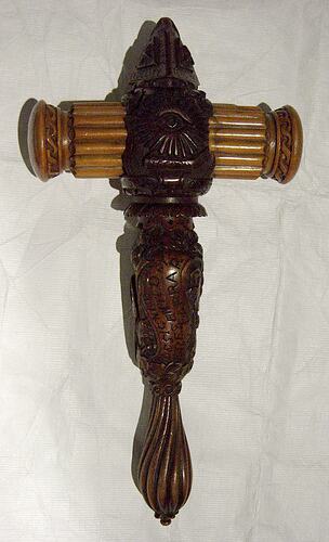 The gavel is elaborately decorated with insignia that has been hand carved and turned. The central column and handle is of a dark wood, with a cross piece of blonde coloured wood; it has been highly polished. The gavel is surmounted by a small, carved, dark wood pyramid shape which has the aims of the organization carved into the sides, e.g. love, temperance, etc.