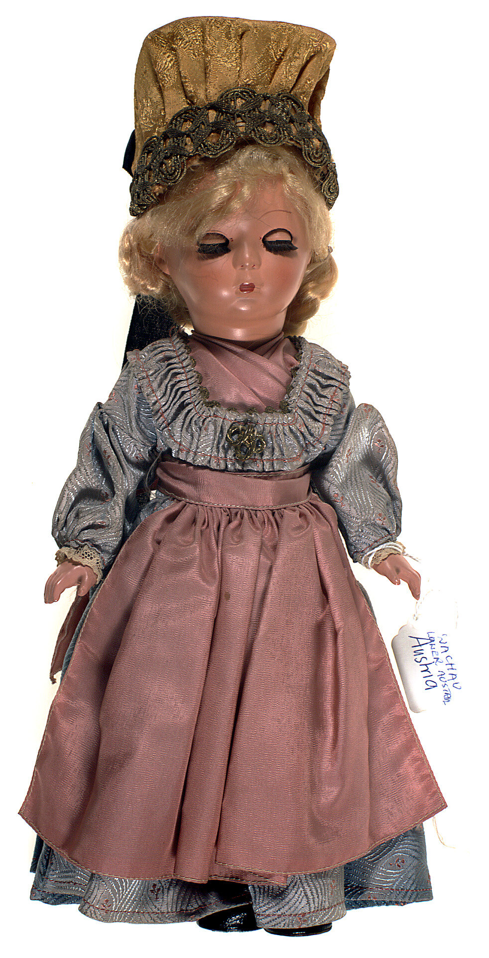 Doll is intended to represent an Austrian woman in the traditional folk dress of the Wachau Valley. -
