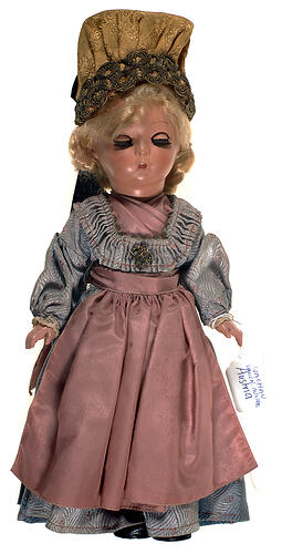 Plastic moulded doll wearing a white petticoat, white underwear, white short socks and synethnic lace up shoes. Her dress is pale blue with pink and blue decoration and covered by a pale pink pinafore. The dress has lace trimming on its cuffs and a gold embroidered motif on its front. The doll has blonde plaited hair and wears a gold hat trimmed with gold embroidery and a black ribbon at the back.