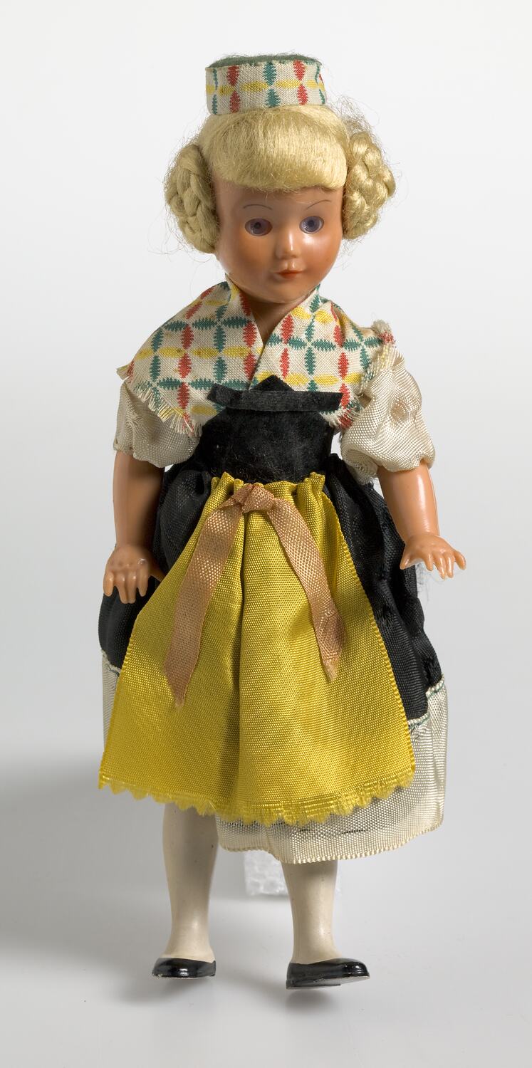 Girl doll with blond hair. She wears black shoes (painted to her feet), white stockings, white underpants, cream petticoat. Black skirt with a cream coloured lining at the bottom.The blouse is from the same material and colour as the lining from the skirt. Over the blouse is a triangle shawl in cream with a green, red, yellow pattern. Her hat is from the same material as the shawl and has a round, green felt top. A black felt sash covers her upper body. The girl has a yellow half pinafore which has in the middle an orange ribbon. She has blond plaits and can open or close her eyes.