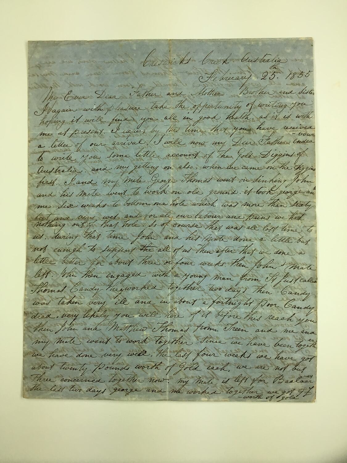 This letter was written from Creswick's Creek where he, friend John Stevens and 20 other Cornish men all arrived on 20 November 1854 having walked for four days from Melbourne, their luggage transported ahead by horse and dray.