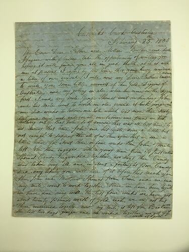 These letters provide a detailed and revealing record of a young Cornish migrant's experiences of mid-nineteenth century shipboard travel and the Victorian goldfields in the years immediately after the gold rush began in 1851. They demonstrate the very real challenges of distance from home, and the stretches of time waiting between letters from distant families. They offer insights into the difference for many miners between the dreams and expectations of quick wealth on the goldfields and the realities of meagre finds and harsh and dangerous working and living conditions.