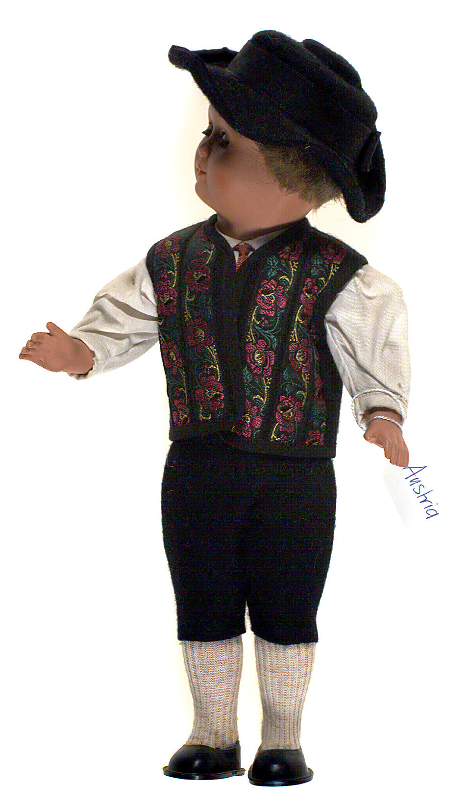 Doll is intended to represent an Austrian man in traditional folk dress -
