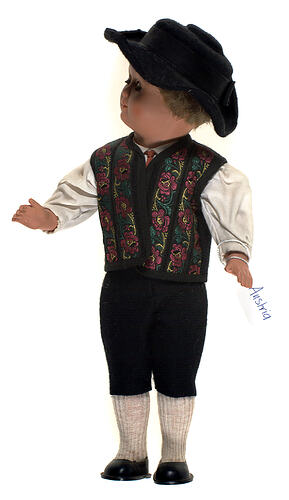 National doll produced to represent an Austrian man. It is one of 17 sent to Monica Gates by her Austrian Grandparents. Monica began receiving these dolls in 1957, they represent various traditions and dress from eight of Austria's states. The costume of this doll is typical of men's traditional dress across Austria which generally consists of lederhosen (leather short with an ornamental belt and suspenders), a hat and short jacket without lapels. Different regions can be identified through the use of colour, embroidery or style of headwear.
