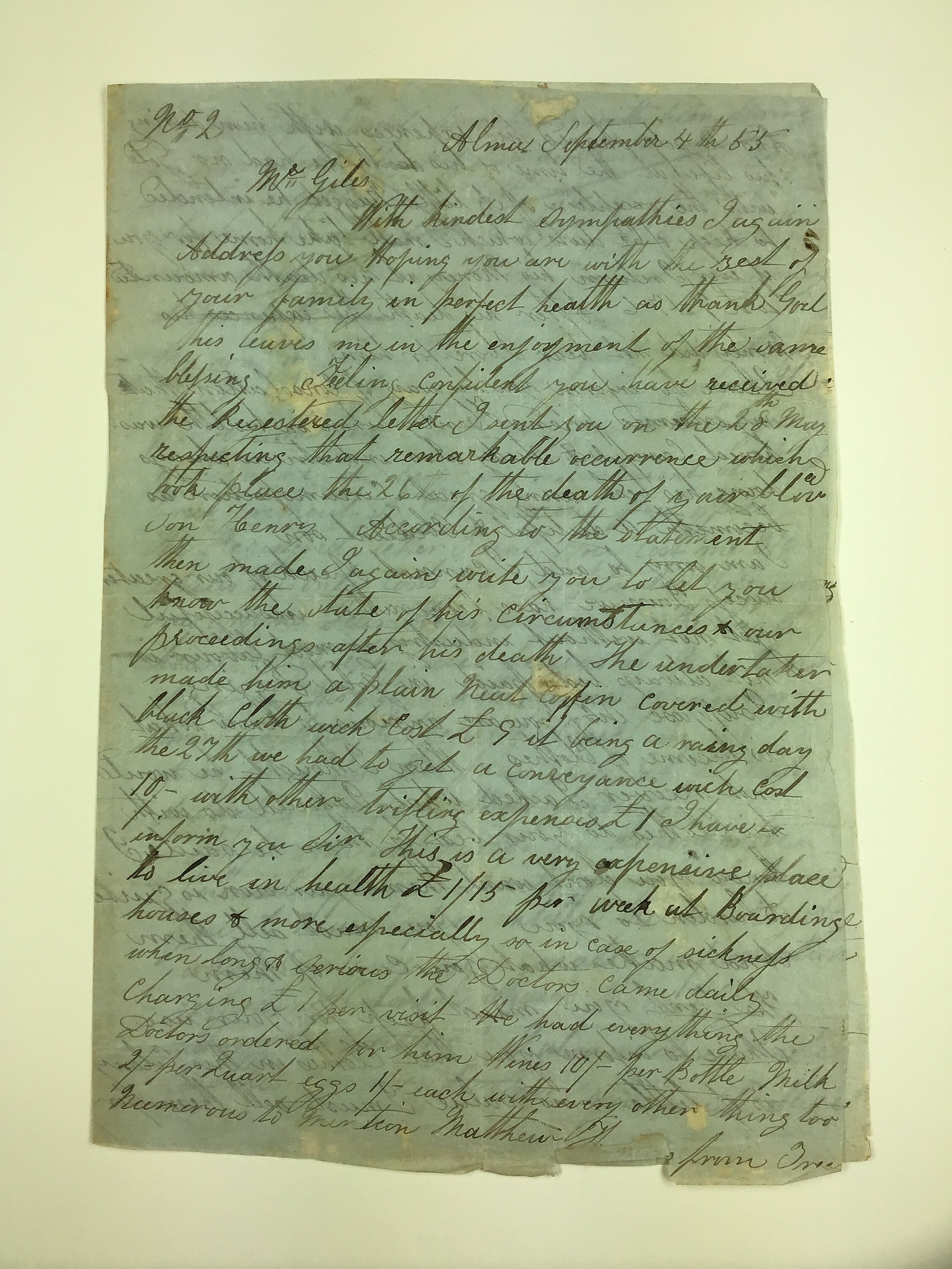 Handwritten letter from John Stevens in Alma Victoria to Henry Giles Senior in Cornwall, England, 4 September, 1855. John and Henry went to Creswick's Creek about 20 kilometres north of Ballarat where European miners had found gold in 1852.
