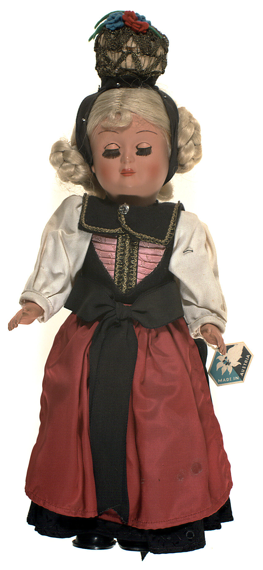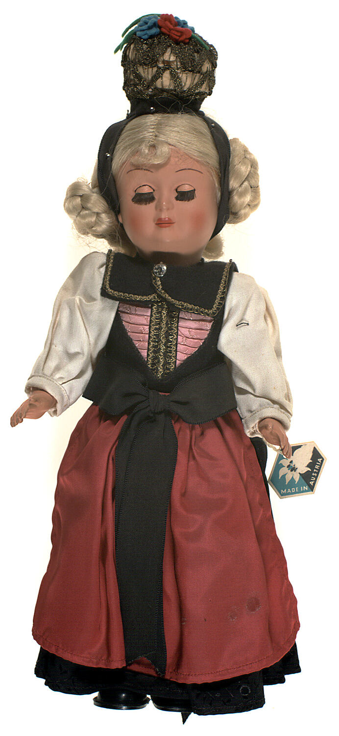 Doll is intended to represent an Austrian woman in traditional folk dress. -