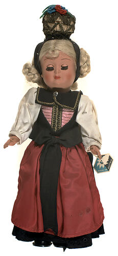 National doll produced to represent an Austrian woman. It is one of 17 sent to Monica Gates by her Austrian Grandparents. Monica began receiving these dolls in 1957, they represent various traditions and dress from eight of Austria's states. This doll is dressed in traditional Austrian women's folk dress, which generally consists of a dirndl skirt, fitted bodice or vest, white blouse, apron, and some form of headwear. Regional differences are shown through the use of various colours, embroidery and the type of headwear.