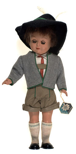 National doll produced to represent an Austrian man. It is one of 17 sent to Monica Gates by her Austrian Grandparents. Monica began receiving these dolls in 1957, they represent various traditions and dress from eight of Austria's states. The costume of this doll is typical of men's traditional dress across Austria which generally consists of lederhosen (leather short with an ornamental belt and suspenders), a hat and short jacket without lapels. Different regions can be identified through the use of colour, embroidery or style of headwear. This doll is intended to represent a man from the region of Styria, whose traditional grey jacket with green lapels, known as the 'Styrian Suit', often regarded the epitome of men's traditional costume in Austria.