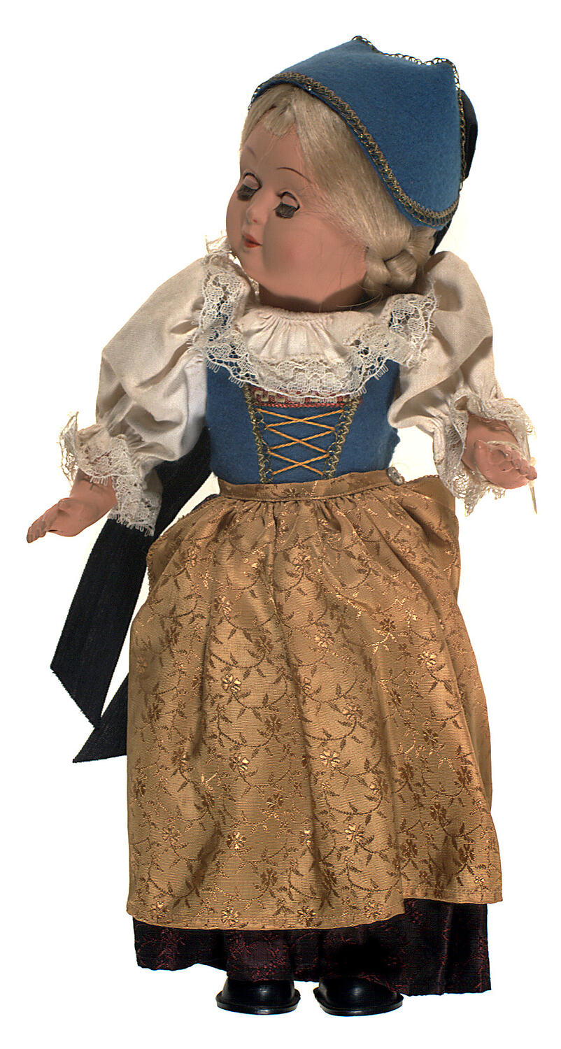 Doll is intended to represent an Austrian woman in traditional folk dress -