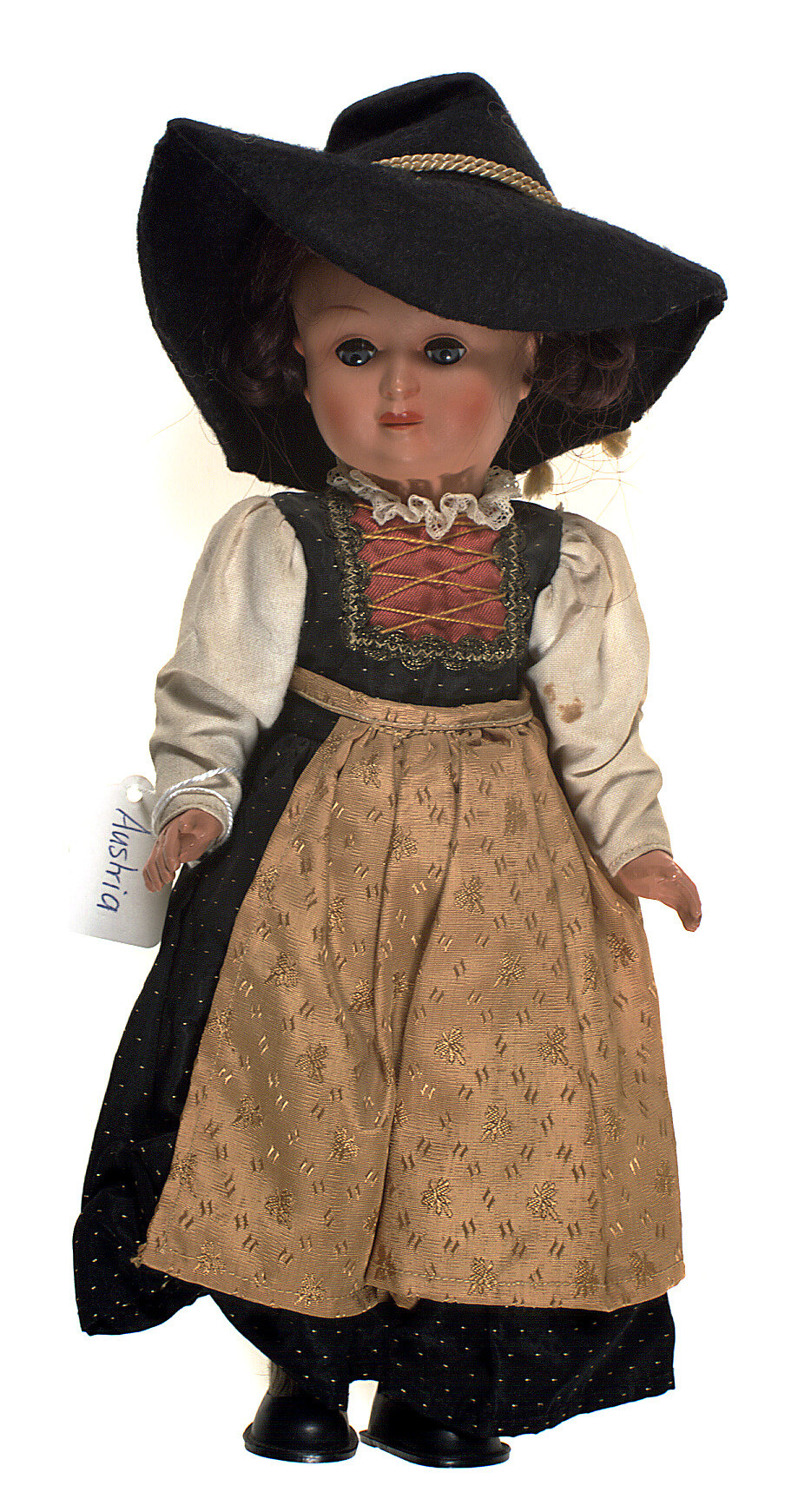 Doll is intended to represent an Austrian woman in traditional folk dress -