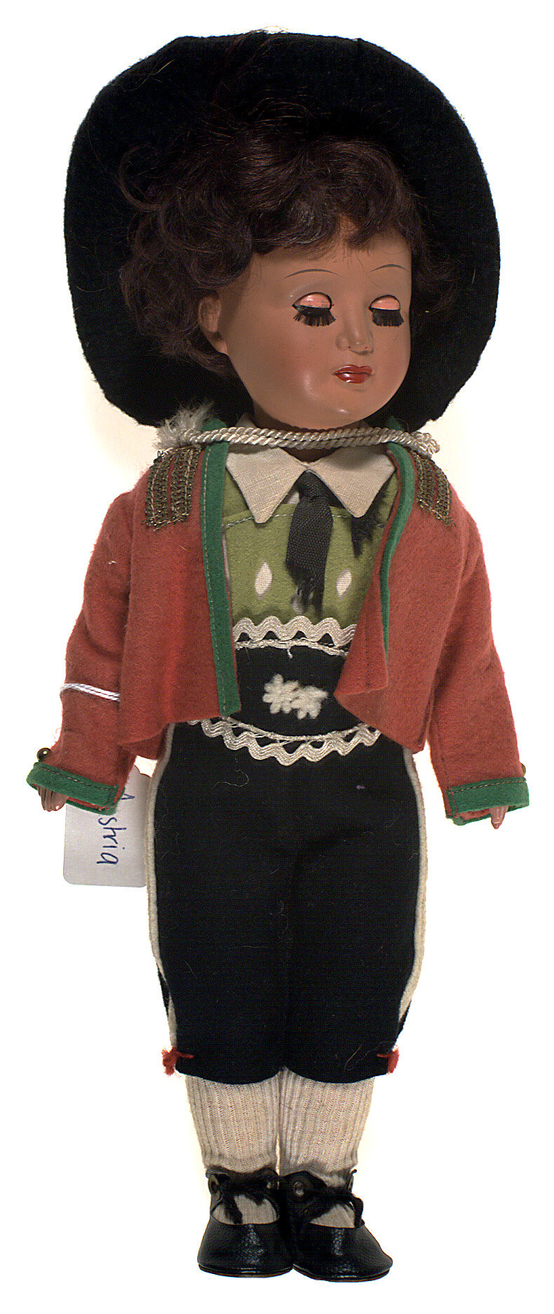 Doll is intended to represent an Austrian man in traditional folk dress -