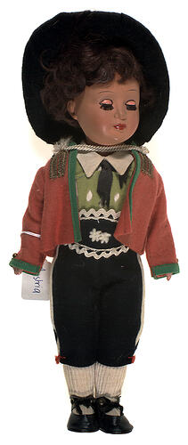 National doll produced to represent an Austrian man. It is one of 17 sent to Monica Gates by her Austrian Grandparents. Monica began receiving these dolls in 1957, they represent various traditions and dress from eight of Austria's states. The costume of this doll is typical of men's traditional dress across Austria which generally consists of lederhosen (leather short with an ornamental belt and suspenders), a hat and short jacket without lapels. Different regions can be identified through the use of colour, embroidery or style of headwear.