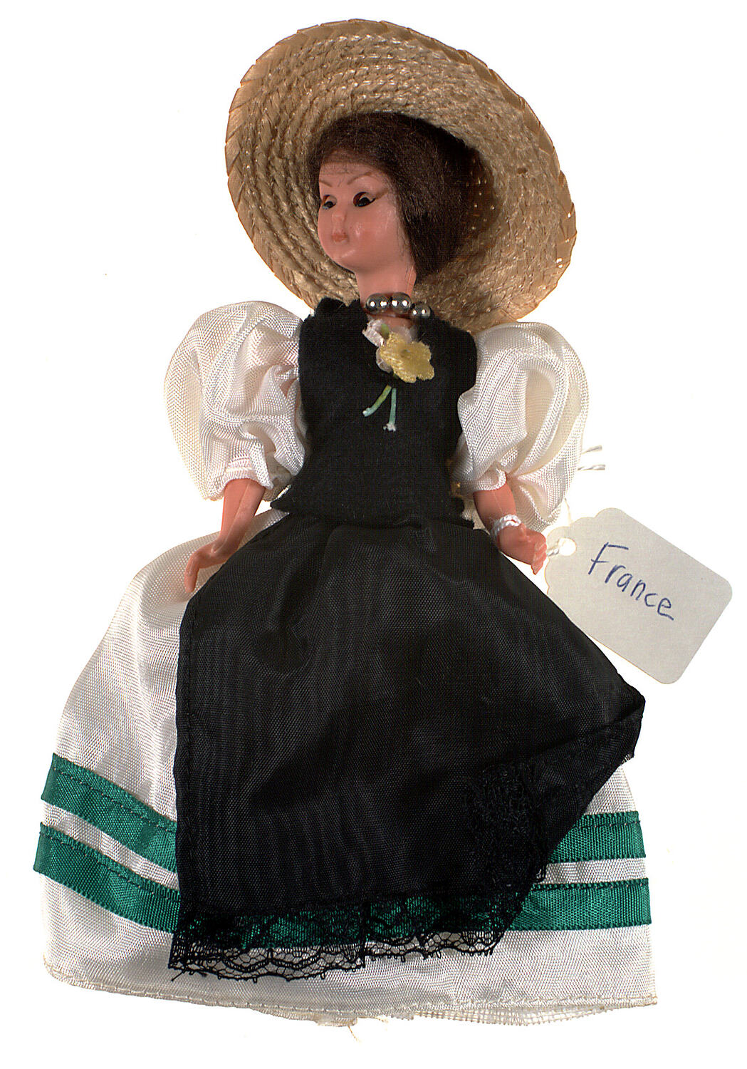 Plastic female doll with sleeping blue eyes. Brown synthetic hair tucked under straw, wide-brimmed hat with green ribbon and decorative arrangement on top, wearing white dress with large puffed sleeves to elbow, full skirt with two bands of green ribbon at bottom. Black felt bodice over dress has two flowers attached at front and black apron is edged in black lace. Stiffened canvas petticoat, flat black shoes and silver look bead necklace. Doll has jointed arms and neck. Head turned towards right.