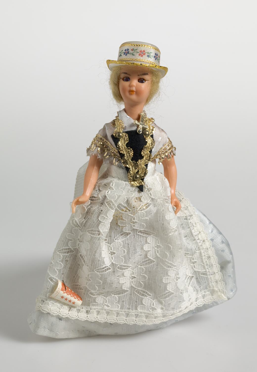 Plastic female doll with sleeping blue eyes. blond hair tucked under a white short top hat trimmed gold braid around edge of brim and floral braid around edge of brim and floral braid around crown, wearing a pale blue spotted skirt and shawl, the latter trimmed in gold lace. Black plastron also decorated in gold trim, studs and cross white lace apron is tied on by broad white ribbon,stiffened mesh petticoat is worn underneath, also high heeled black shoes. Arms and neck are jointed. Paper label attached to front in shape of coat-of-arms in red and white.