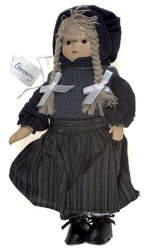 National doll produced to represent a German woman, it is one of 8 sent to Monica Gates by relatives in Germany for birthdays etc. Monica began receiving these dolls in 1959, they represent various traditions and dress across Germany. This doll is dressed in traditional German women's folk dress, which generally consists of a dirndl skirt, fitted bodice or vest, blouse, apron, and some form of headwear. Regional differences are shown through the use of various colours, embroidery and the type of headwear. The style of clothing worn by this doll suggests she is dressed to represent the traditional clothing worn in the North of Germany, which is characterised by the use of heavy fabrics in dark colours, and the use of two scarfs for everyday headwear was common.