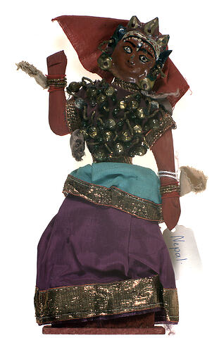 Doll, wooden, female. She has a burgundy coloured bodice covered in gold wire with attached gold beads. The yoke of her dress is green and the skirt is purple. There is gold edging on the hems of the yoke and skirt and around the neck and sleeves. She has a red scarf at the back of her head and a sunray headdress in gold, green and pink. She is mounted on a red painted rectangular wooden base.
