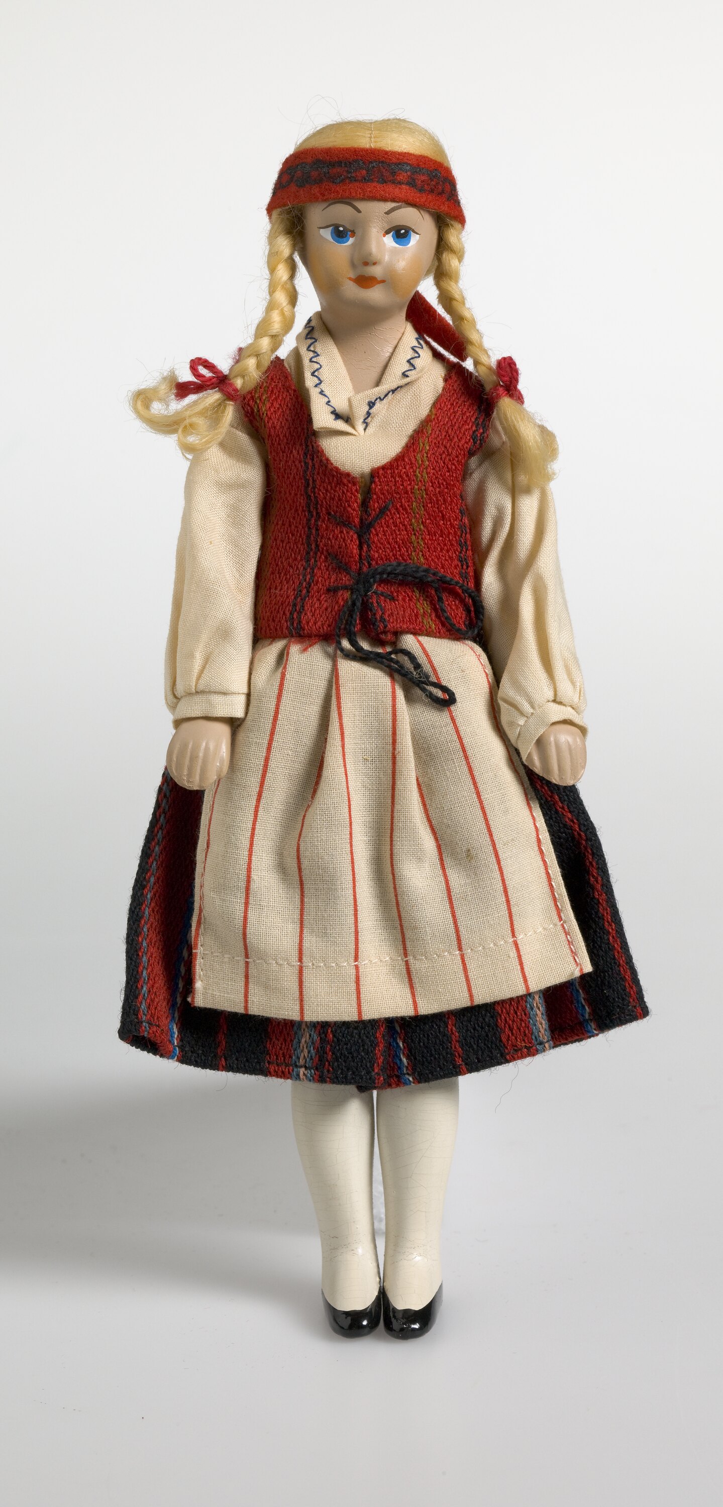 Doll, hollow soft plastic. Dressed in a cream bodice with blue stitching around the collar. She has a black and red striped skirt and a red vest with fine black stripes. She also has a white cotton apron with fine red stripes and a red headband with a pattern on the front. Her hair is blonde and is in two plaits with red ties.