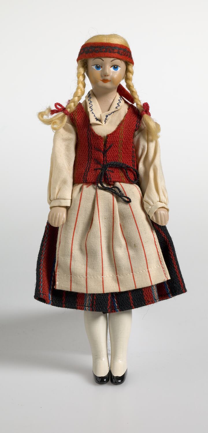 National doll produced to represent a Finnish woman in regional costume. It was likely made by dollmaker Martta Nukketeollisuus. It was given to Monica Gates circa1970s-1980s. Norway is situated on the western side of the Scandinavian peninsula. Folk or national costumes (bunad) are owned by many men and women today. These costumes are based on local traditional peasant apparel, women's costumes include elaborate skirts, blouses, jackets, stockings, and shoes adorned with silver pins and decorations. Design and colours of costumes vary according to locality so that each large fjord or valley has a distinctive costume. Many costumes combine traditional elements with contemporary ideas and designs.