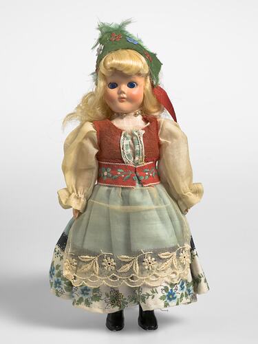 Doll, plastic, female. She is wearing a dress comprising of a white muslin bodice and light blue skirt. At the hem of the skirt is a deep white border decorated with a floral pattern. She has a red vest with a red braid border around the waist. She has a green felt cap with flowers and a red and yellow ribbon and a white net apron with white floral embroidery on the lower edge. She has loose blonde, shoulder length hair.