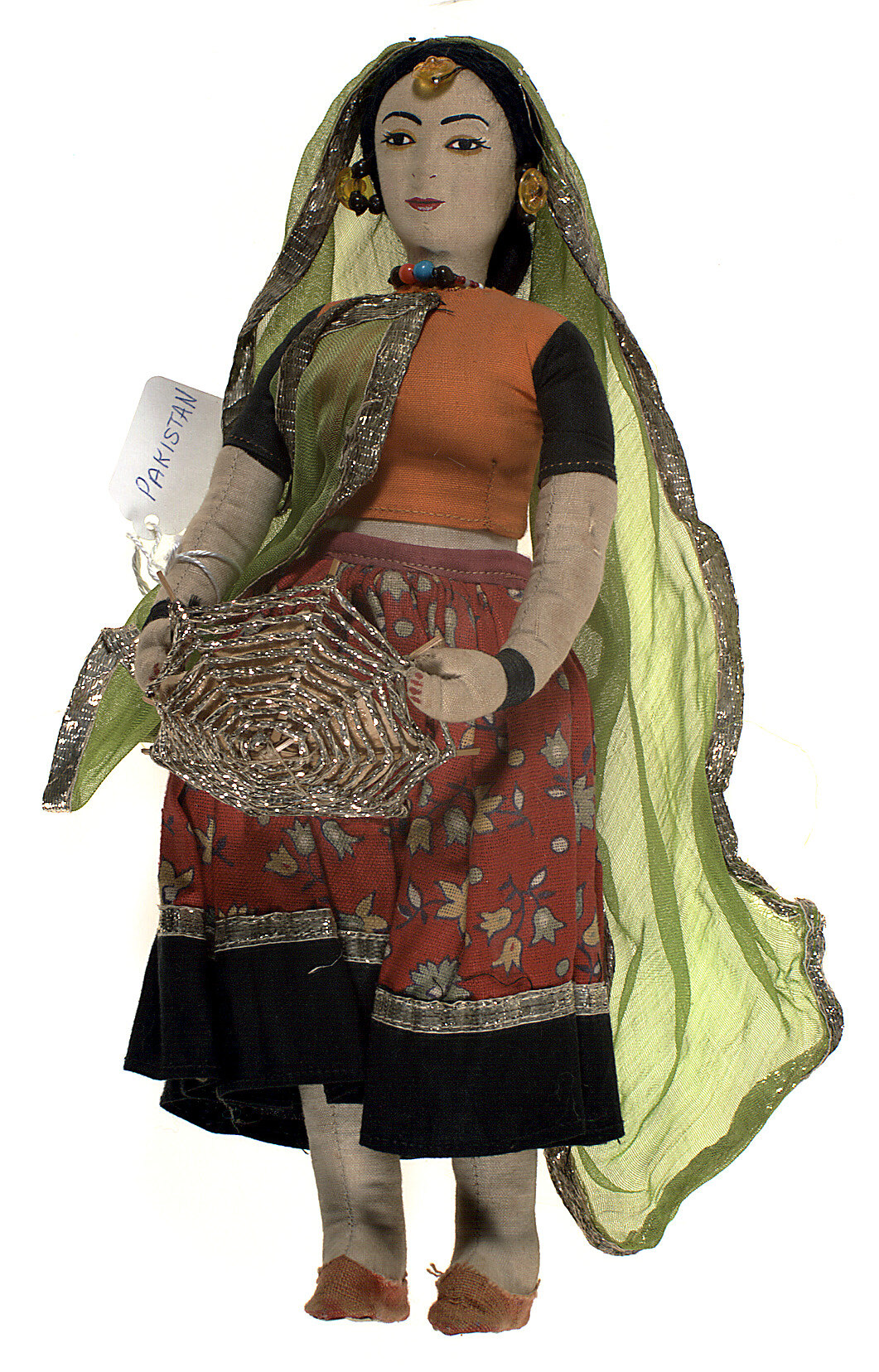 National doll produced to represent a Pakistani woman. It was sent to Monica Gates by Begum D. A. Hidayatullah, General Secretary, All Pakistan Women's Association, in 1961. In the accompanying letter it states that the doll is dressed in Ghagra Choli which is worn in the suburbs and countryside.