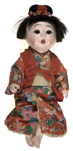 National doll produced to represent a Japanese woman. It was given to Monica Gates, circa 1970s-1980s. The doll is dressed in a kimono which is a t-shaped, straight-lined robe worn so that the hem falls to the ankle, with an attached collar and long, wide sleeves. Kimonos are wrapped around the body, with the left side over the right (except when dressing the dead for burial), and secured by a sash called an obi, which is tied at the back. Once worn by women, men and children they are now most commonly worn by women for special or formal occasions.