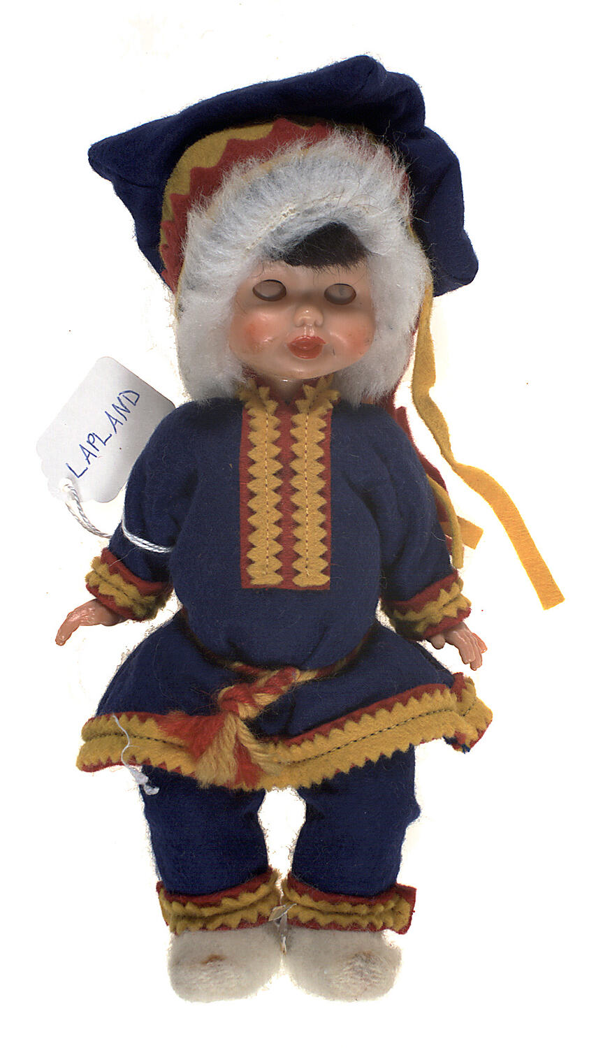 Doll, plastic, with eyes that close when laying down. Doll is dressed in dark blue felt trousers and tunic top. These have a yellow and red trim at cuffs and yoke. The doll is wearing a dark blue felt hat with white furry trim around the face and yellow and red edging and tassels. The doll also has a yellow and red cord tie around its waist and white fluffy shoes.