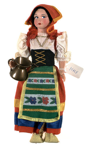 National doll produced to represent an Italian woman, it is one of 10 Italian National Dolls collected for Monica Gates by her mother during an overseas trip in the 1970s. These dolls represent various traditions and dress throughout Italy. Women's folk costumes in Italy are comprised of several basic elements: shirt and skirt, apron, head covering either a head scarf, hat or both, stockings and shoes. Colour, ornamentation, fabrics and the style of individual items are used to denote regional differences. This doll is intended to represent a woman from Rome or the surrounding countryside.