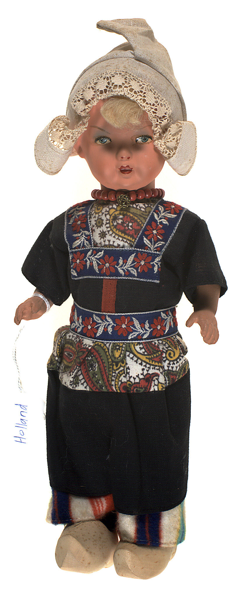 National doll produced to represent a Dutch woman. It was given to Monica Gates circa1970s-1980s. The costume of this doll is typical of women's folk dress in the Netherlands which generally consists of a long skirt, blouse, an apron, perhaps a shawl, some form of headwear either a hat or head scarf and wooden clogs. Regional differences are shown through the use of various colours, embroidery and the type of headwear.