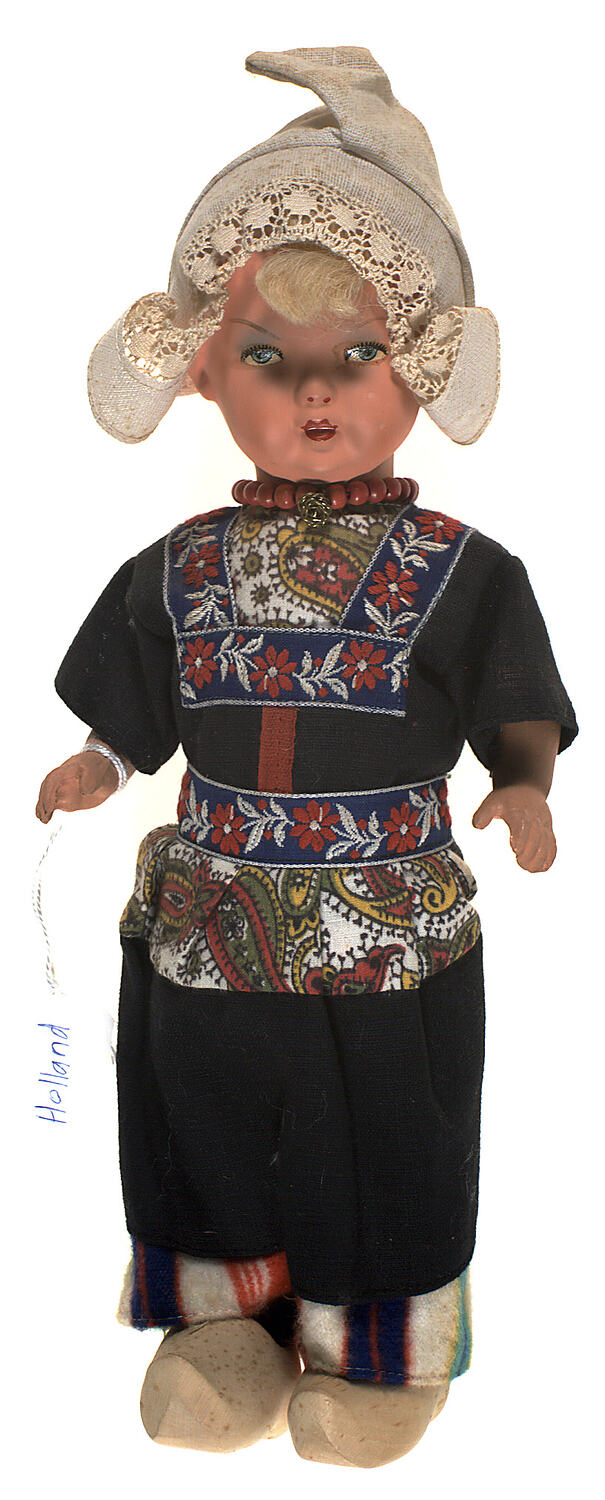 Doll intended to represent a Dutch woman in traditional folk dress. -