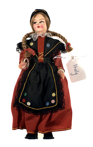 National doll produced to represent an Italian woman, it is one of 10 Italian National Dolls collected for Monica Gates by her mother during an overseas trip in the 1970s. These dolls represent various traditions and dress throughout Italy. Women's folk costumes in Italy are comprised of several basic elements: shirt and skirt, apron, head covering either a head scarf, hat or both, stockings and shoes. Colour, ornamentation, fabrics and the style of individual items are used to denote regional differences.