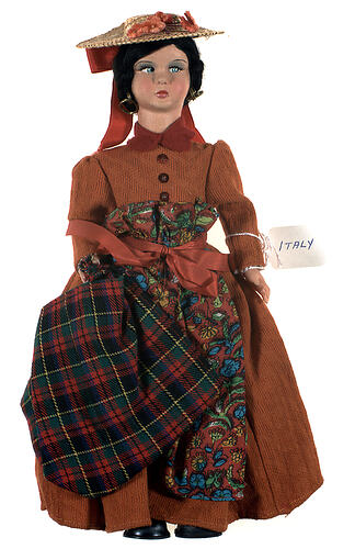 National doll produced to represent an Italian woman, it is one of 10 Italian National Dolls collected for Monica Gates by her mother during an overseas trip in the 1970s. These dolls represent various traditions and dress throughout Italy. Women's folk costumes in Italy are comprised of several basic elements: shirt and skirt, apron, head covering either a head scarf, hat or both, stockings and shoes. Colour, ornamentation, fabrics and the style of individual items are used to denote regional differences. The doll is intended to represent a woman from the historic region of Romagna in Northern Italy, which is today part of the administrative region of Emilia-Romagna.