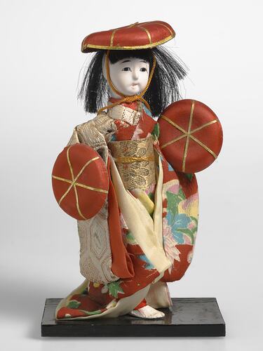 Doll, female, Japanese. Bisque head, hands and feet. Glass or plastic inset eyes, painted features. Black hair which hangs loose to shoulder with fringe at front and topped by flat circular hat trimmed with gold braid and tied on by long orange cord. Kimono predominantly red with large floral pattern and long flowing sleeves. Extra long gold brocade sleeve on right arm. Gold brocade obi tied at back with ends folded down. Doll holds a red hat in each hand. Bare feet are attached to low lacquered-look wood platform. Two blue labels are stuck to underside of stand.