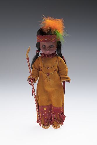 Female doll from Canada wearing an orange dress with red trimmings. She has a red head band with orange, yellow and green feathers sticking out of it. On her feet are orange moccasins with some red decorations. Her hair is black and tied at either side of her head. In her hand she hold a pole which resembles a spear.