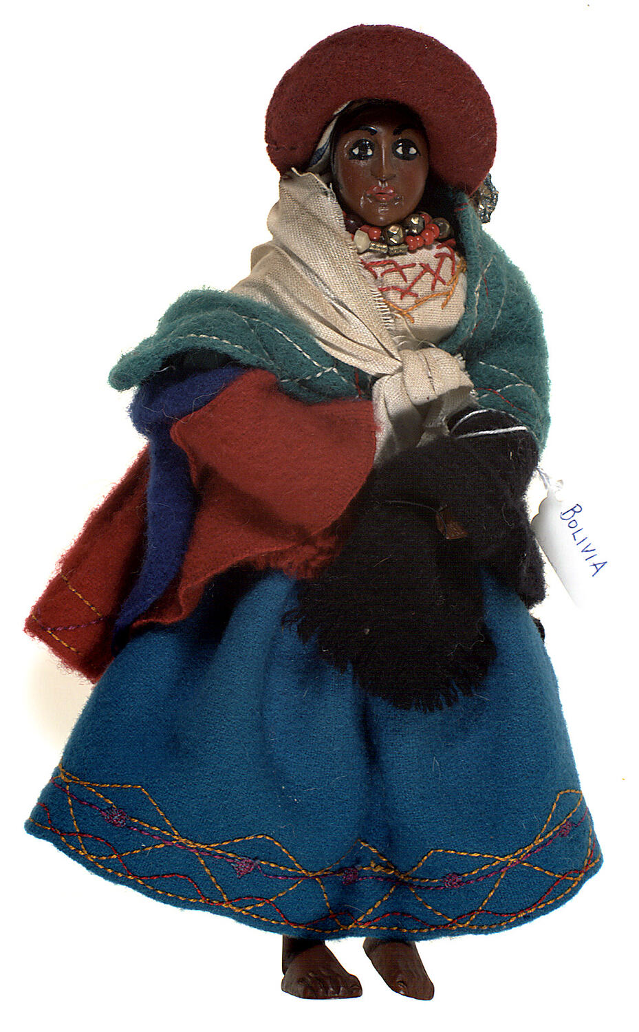 National doll produced to represent a Bolivian woman. It was given to Monica Gates circa1960s by friends or family who had visited South America. Bolivian culture consists of a mixture of the various indigenous Indian cultures, the largest groups are Quechuas and Aymaras, with aspects of 18th Century Spanish culture.