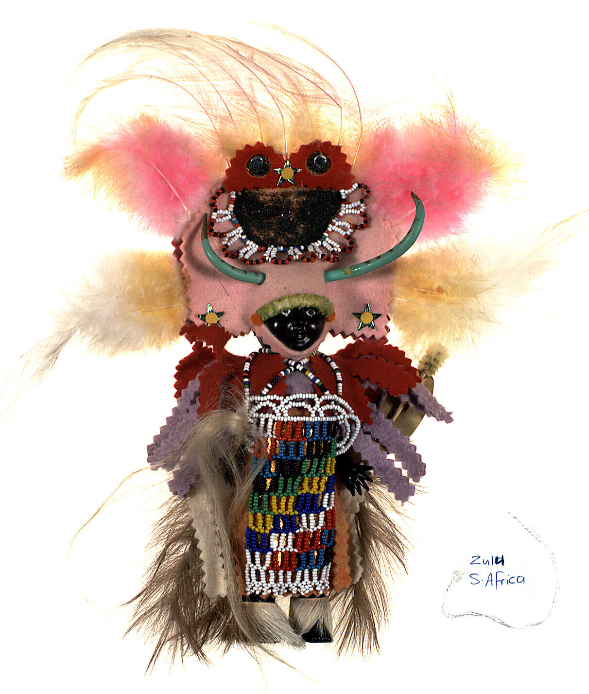 National doll produced to represent a Zulu man, it was sent to Monica Gates by a girl who she met in New Zealand in 1976. The girl was a white South African and sent the doll to Monica when she heard that she collected national dolls.