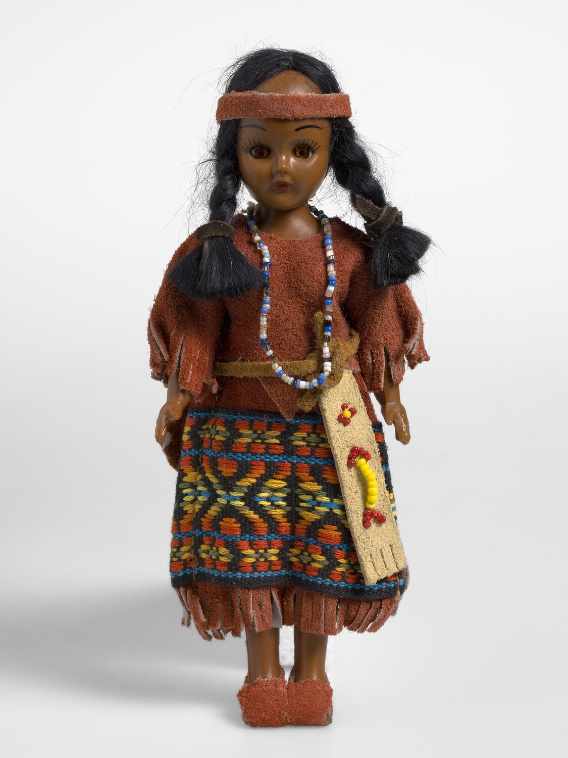 Doll is intended to represent a typical Indigenous person from the United States of America, also commonly known as American Indian or Native American. -