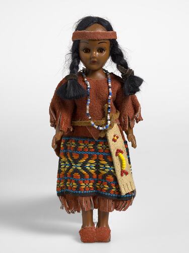 National doll produced to represent a North American Indigenous, Native American or American Indian woman, it was given to Monica Gates, circa 1970s-1980s. In 2011 estimates of the American Indian population vary between about 1% to 2% of the total population of the USA depending on the way American Indians are defined. The USA government recognises just approximately 330 Native American tribes in the lower 48 states of the USA (this excludes Hawaii and Alaska) and there approximately 150 tribes are not recognised by the USA government. Like many Indigenous peoples the relationship of American Indian people with the natural environment plays a key role in their traditions and culture, including the style and materials of their dress. Choice of materials, colour, style, type of garments and ornamentation distinguish different groups.
