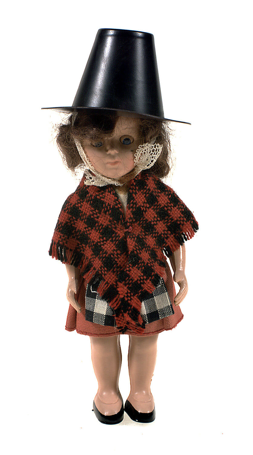 Female doll dressed in a red skirt with a cream sleeveless top. She has an apron around her waist and a black and red checked shall around her shoulders. She has a tall black hat which is tied under her chin with a cream, lace ribbon. Her shoes are black. Her eyes are open, but they close when she reclines.