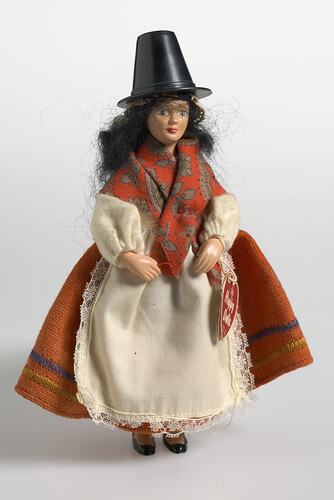 Female doll wearing a thick red skirt with a band of yellow and a band of blue stitching around the bottom.Over this she has a cream apron with lace edging. This matches the her cream shirt. Around her shoulders she has a red scarf with a brown floral design printed on it. She also has a tall black hat with cream ribbon under it. She has long black hair. Her facial features are painted on. She wears a cream petticoat and black shoes.