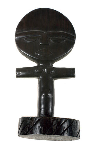 Dark, carved wooden doll with a large circular head. On the front there are stylised facial features carved. The body has arms straightened out to the sides and a straight torso with no legs defined. There are some anatomical features carved on the front of the body, the back bear. It has thick circular wooden base with some decorative carvings on it.