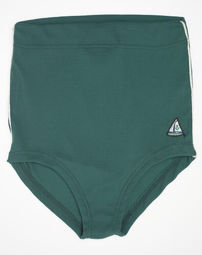 Men's bathing costume of dark green nylon, size 40. There is a drawstring at the waist and a white strip down each side. On the front L side is a small picture of a yacht sewn on.
