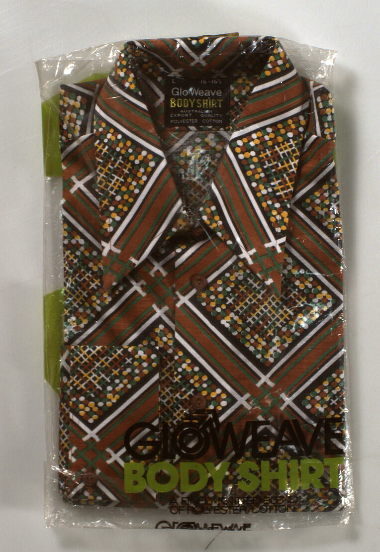 On tag inside collar: L 16-16 1/2/Glo-Weave/BODY SHIRT/ AUSTRALIAN/EXPORT QUALITY/POLYESTER COTTON On front of bag: GLOWEAVE/BODY SHIRT/A FINELY KNITTED BLEND/OF POLYESTER/ COTTON On back of bag: GLOWEAVE/BODY SHIRT/WASHING INSTRUCTIONS: [Further inscriptions detail these instructions]